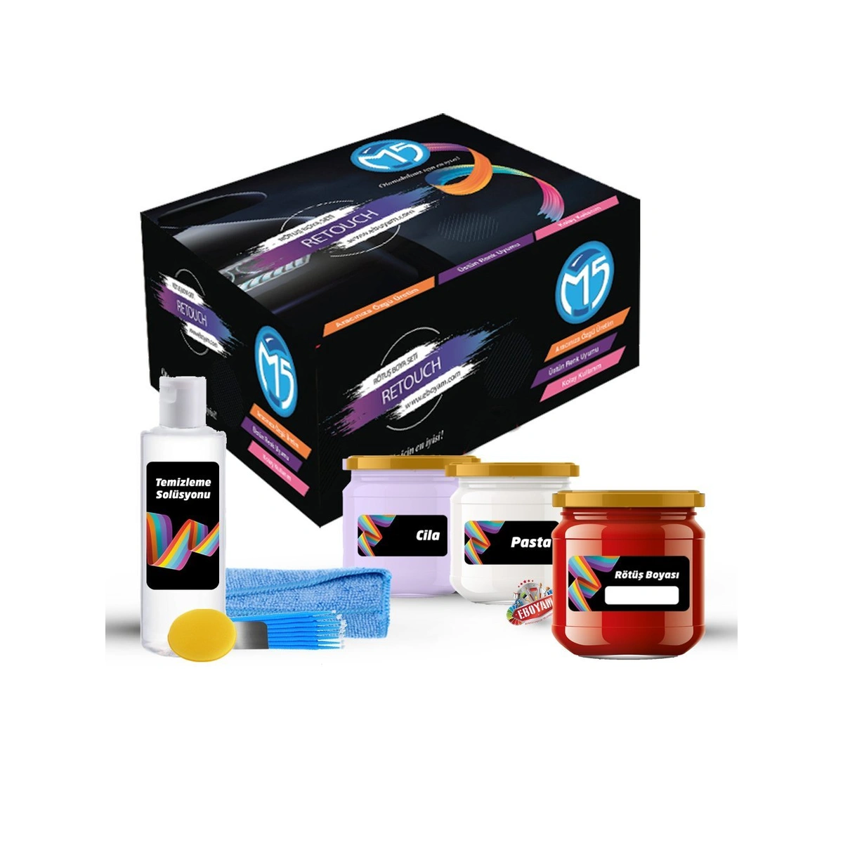 M5 Retouch’ın her marka ve modele göre aracınıza özel rengi bulunmaktadır. Rötuş seti içerisinde bulunan özel renk kodlu rötuş boyası, Profesyonel detaycıların kullandığı özel M700 temizleme solüsyonu, Türkiye en çok tercih edilen Farecla Pasta,özel cila ve rötuş yaparken kullanacağınız gerekli malzemeler uygulamanızın kusursuz olmasına olanak veriyor.